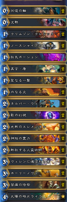 沈黙は火力のドローを重視する普段の構築には入らないカードですが、たまに欲しくなるのも事実です。それを自然と行えるのがこの沈黙30枚構築で、とにかくミニオンの質を上げてそれを呪文でサポートする形になっています。