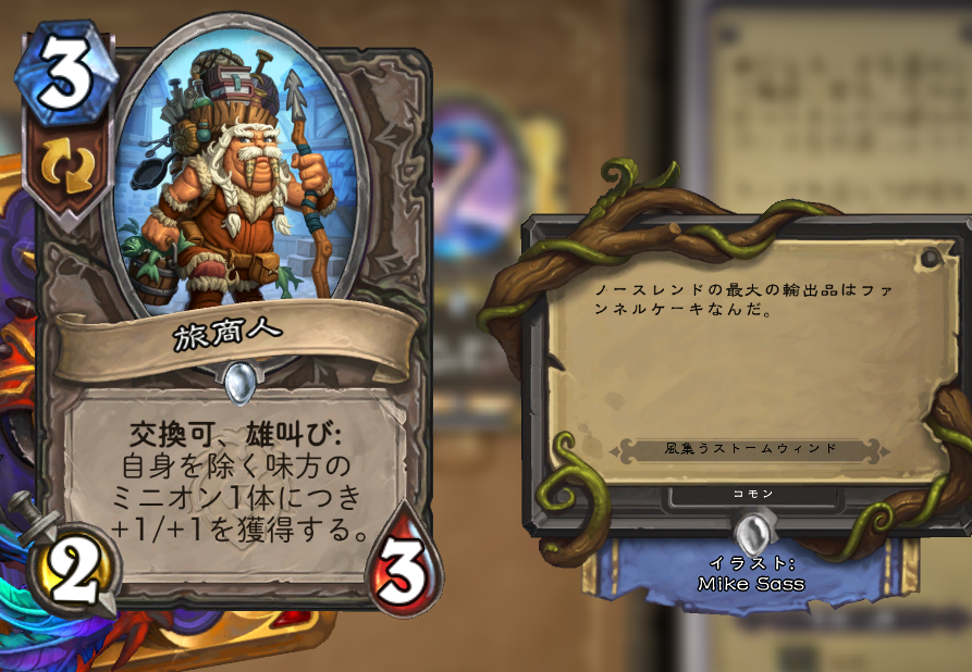 そこで第二の択になるのがこのカードで、シャドウボンバーの部分をこのカードに置き換えても4点は入るため、フェルウィングの踏み倒しは可能です。もちろん相手の動きに対し都合の良い手札になるかは運ですが、初手でミニオンに蓋をされるとヒーローパワー(ツアーガイド)を割かざるを得なくなっていた今までからするとかなり変わっていると言えるでしょう。